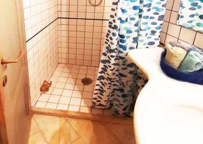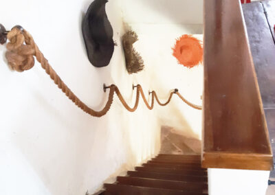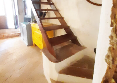 Über eine Wendeltreppe gelangt man in den Wohnbereich. Ein gemütliches Wohnzimmer mit offenem Kamin, ein Badezimmer mit Dusche und Bidet und der Ausgang zu der zauberhaften Terrasse findet sich hier. Auf der mittleren Etage gibt es auch ein Schlafsofa als dritte Schlafgelegenheit.
