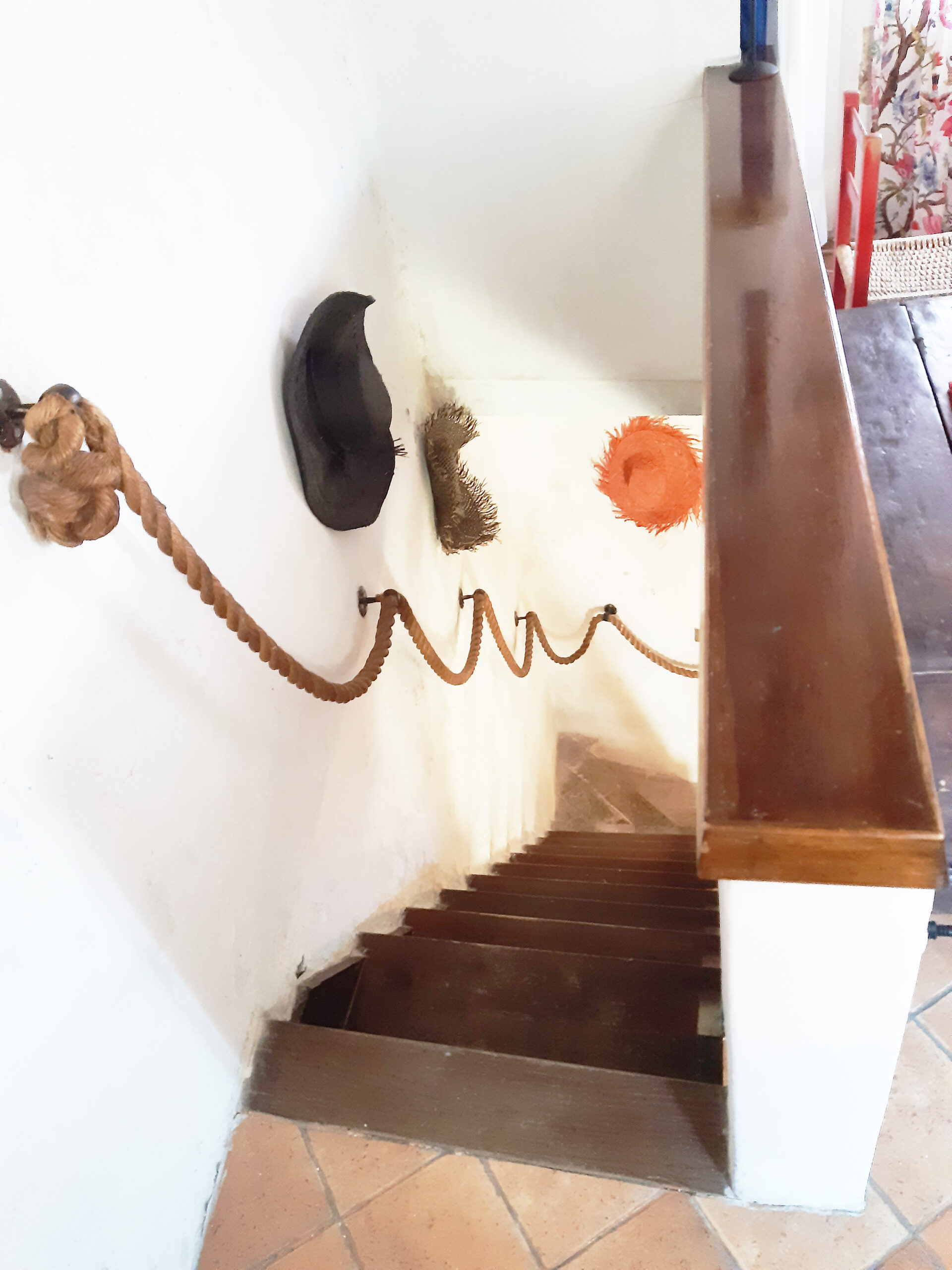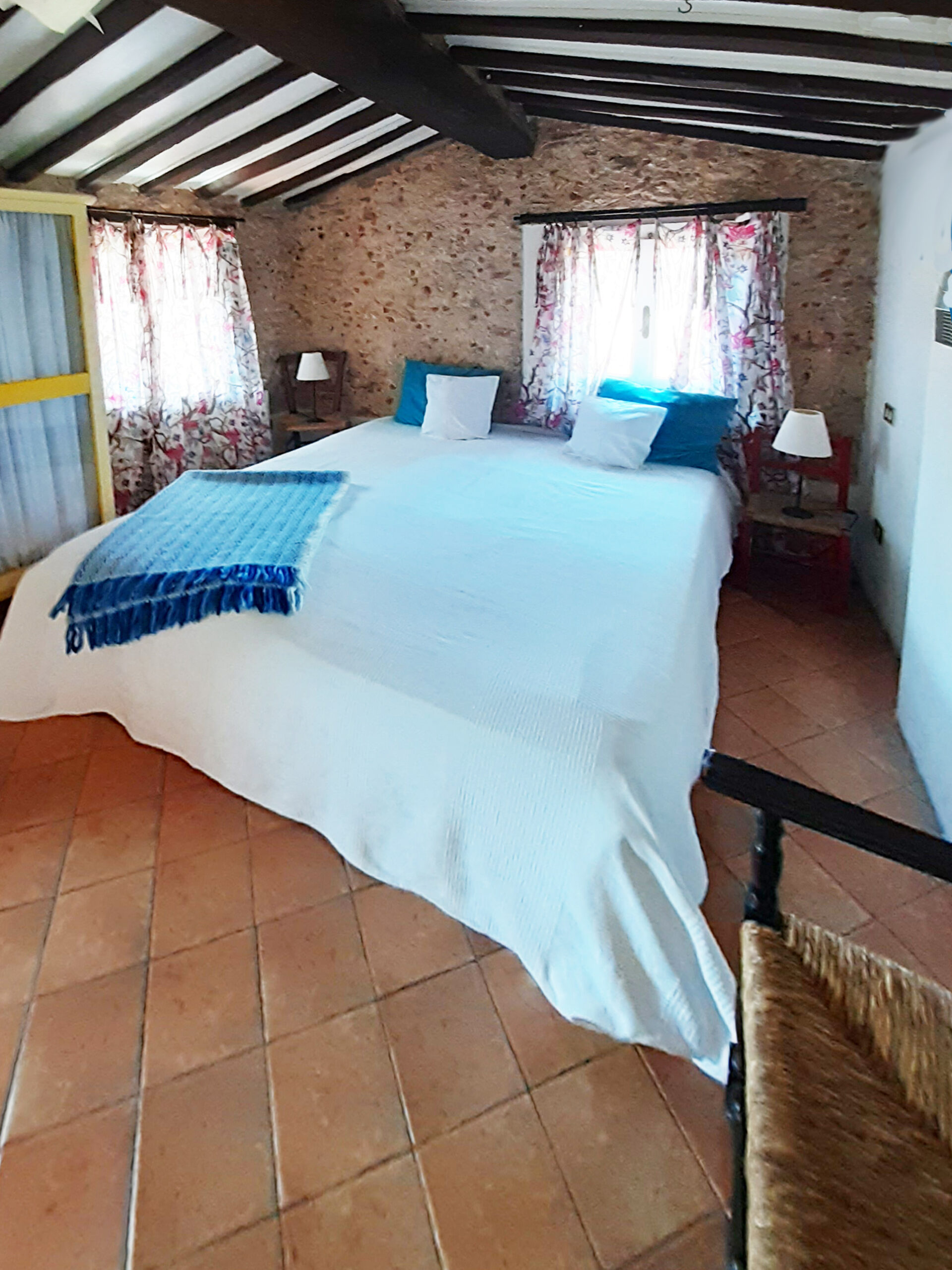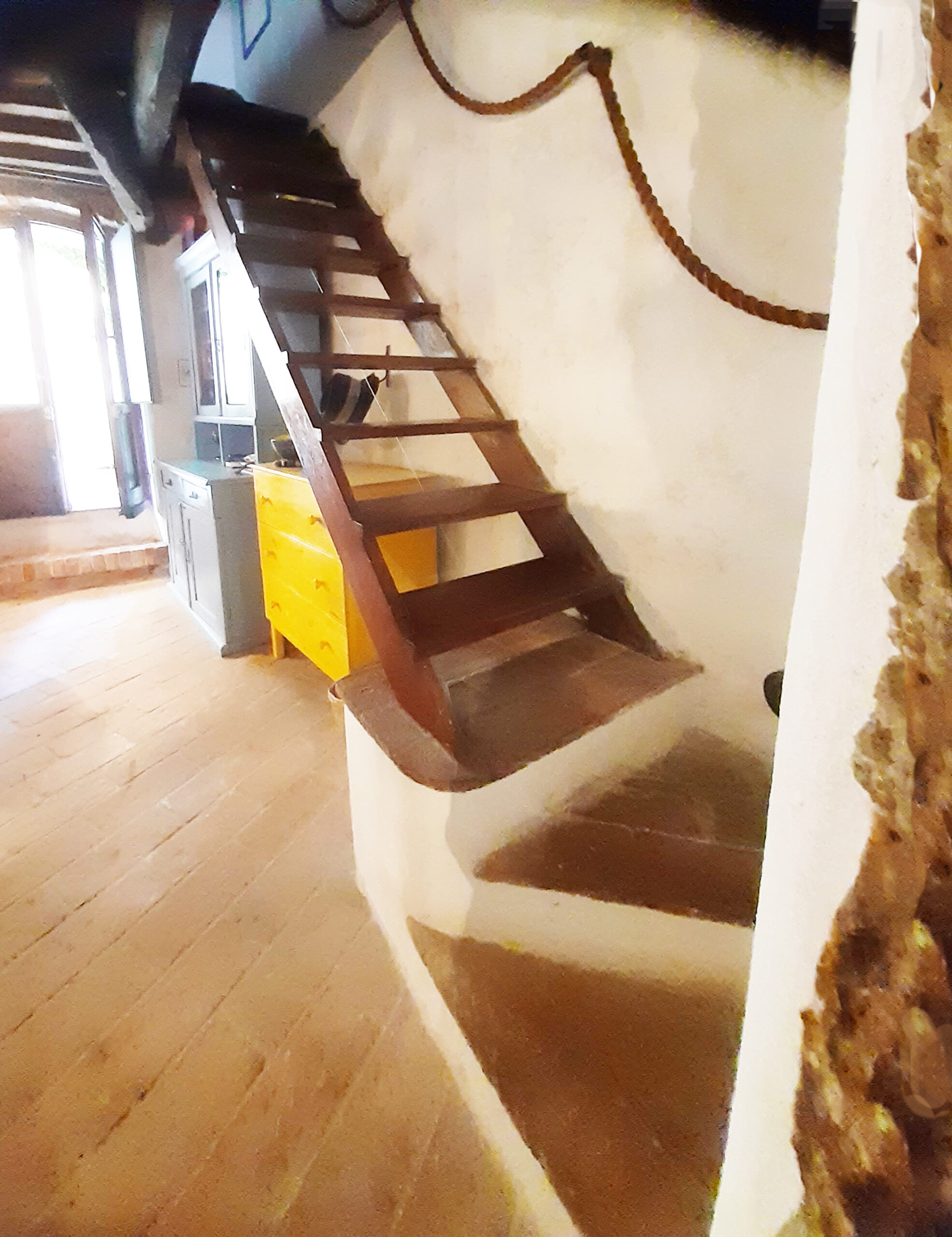 Über eine Wendeltreppe gelangt man in den Wohnbereich. Ein gemütliches Wohnzimmer mit offenem Kamin, ein Badezimmer mit Dusche und Bidet und der Ausgang zu der zauberhaften Terrasse findet sich hier. Auf der mittleren Etage gibt es auch ein Schlafsofa als dritte Schlafgelegenheit.