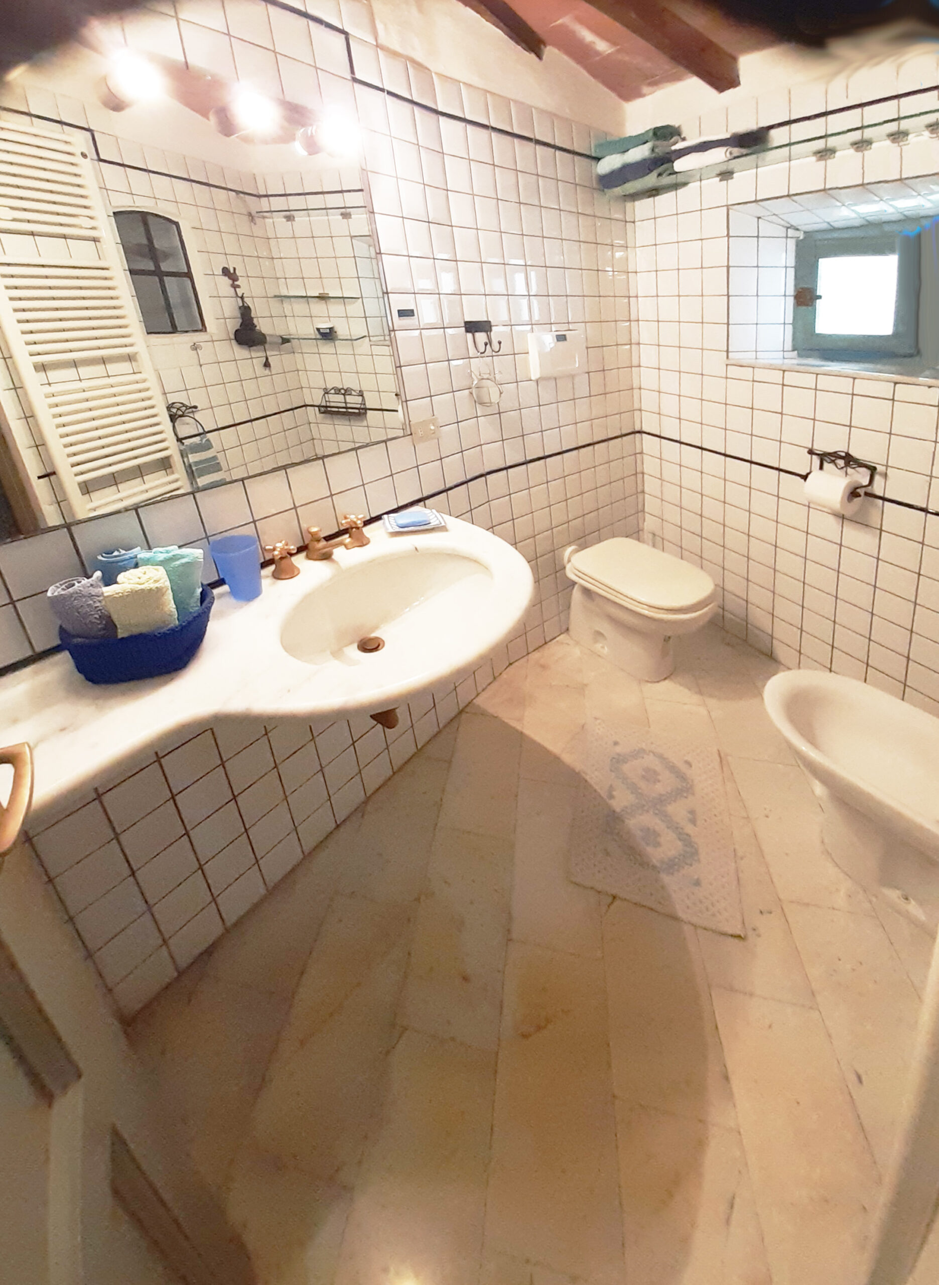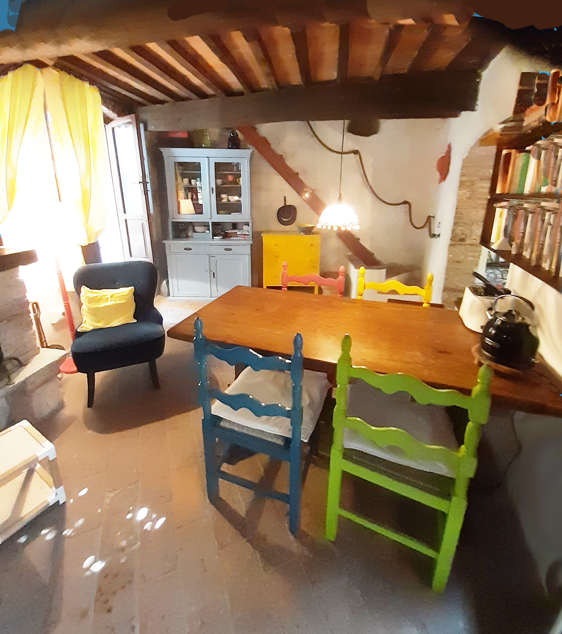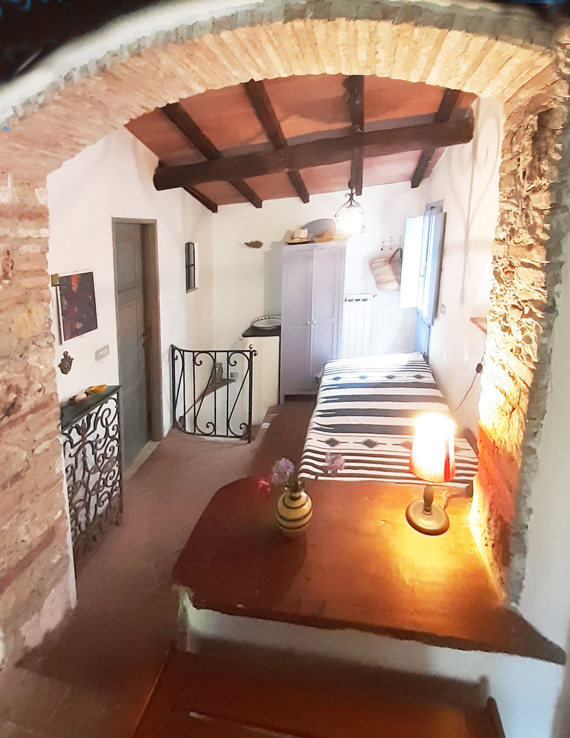 Eine Alternative für zwei bis drei Gäste zu Casa Berti, falls Sie lieber in einem Ort wohnen, ist die Villina d’Elsa. Das Häuschen liegt in dem mittelalterlichen, autofreien Dorf Monteggiori. Mit seinen gut 60 qm auf drei Etagen (jede mit einem eigenen Eingang!) nutzt man ein kleines, aber sehr gemütliches Reich. Unten betritt man die funktionell ausgestattete Küche mit Waschmaschine, Espressomaschine, großem Kühlschrank, Gasherd und allem, was man zum Kochen so braucht.